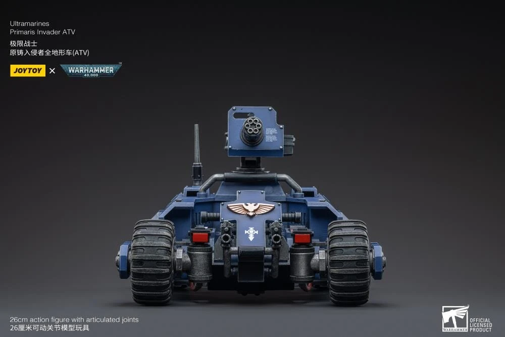 The most elite of the Space Marine Chapters in the Imperium of Man, Joy Toy brings the Ultramarines from Warhammer 40k to life with this new series of 1/18 scale figures and accessories.This 1/18 scale ATV features four big tread wheels and a large turret gun affixed to the back. Highly detailed and realistically weathered, the Primaris Invader ATV can carry two ultramarines and various accessories (not included).